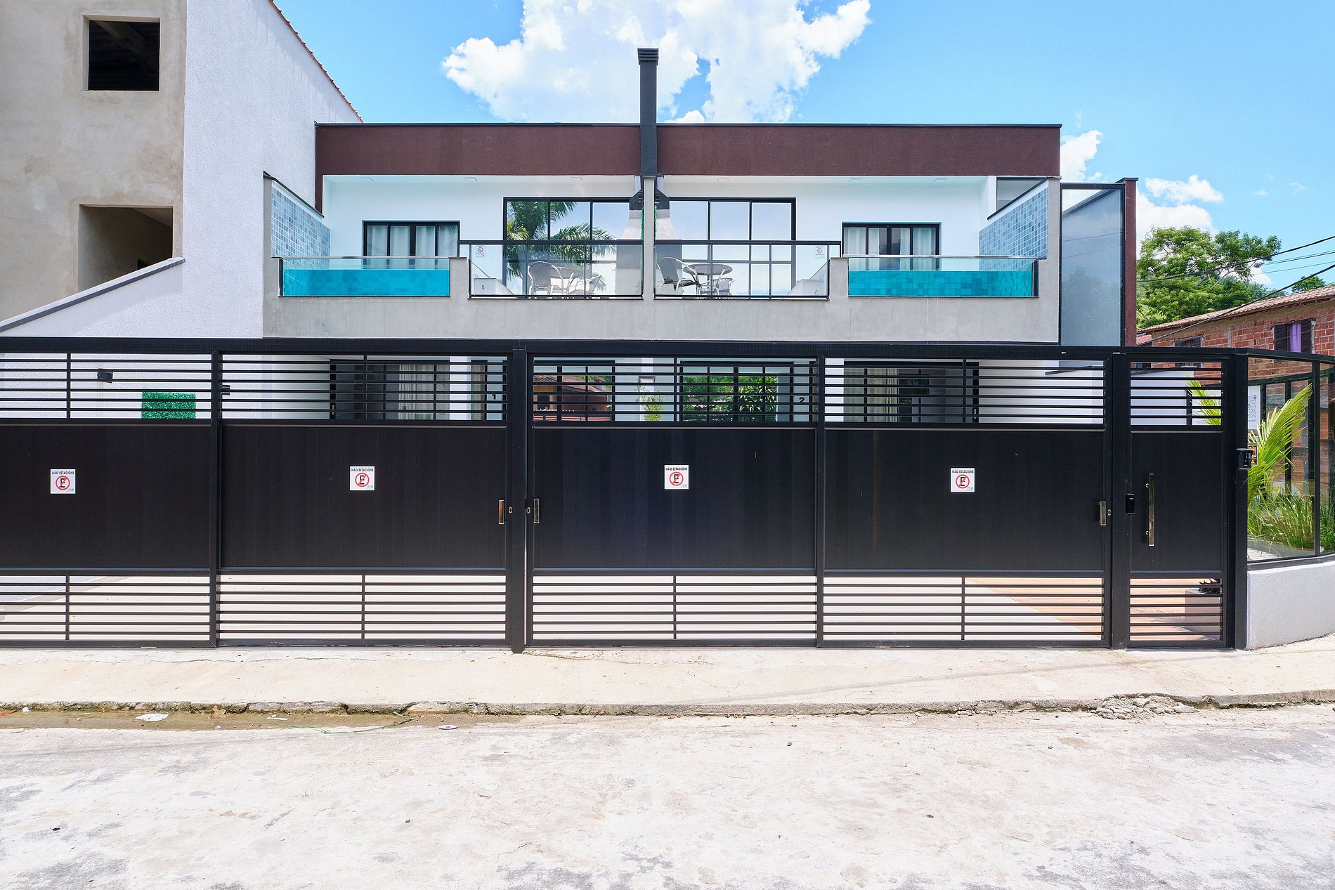Cada casa tem 1 vaga de garagem na frente para carros médios. Carros grandes devem parar na rua (parar na rua não é problema).