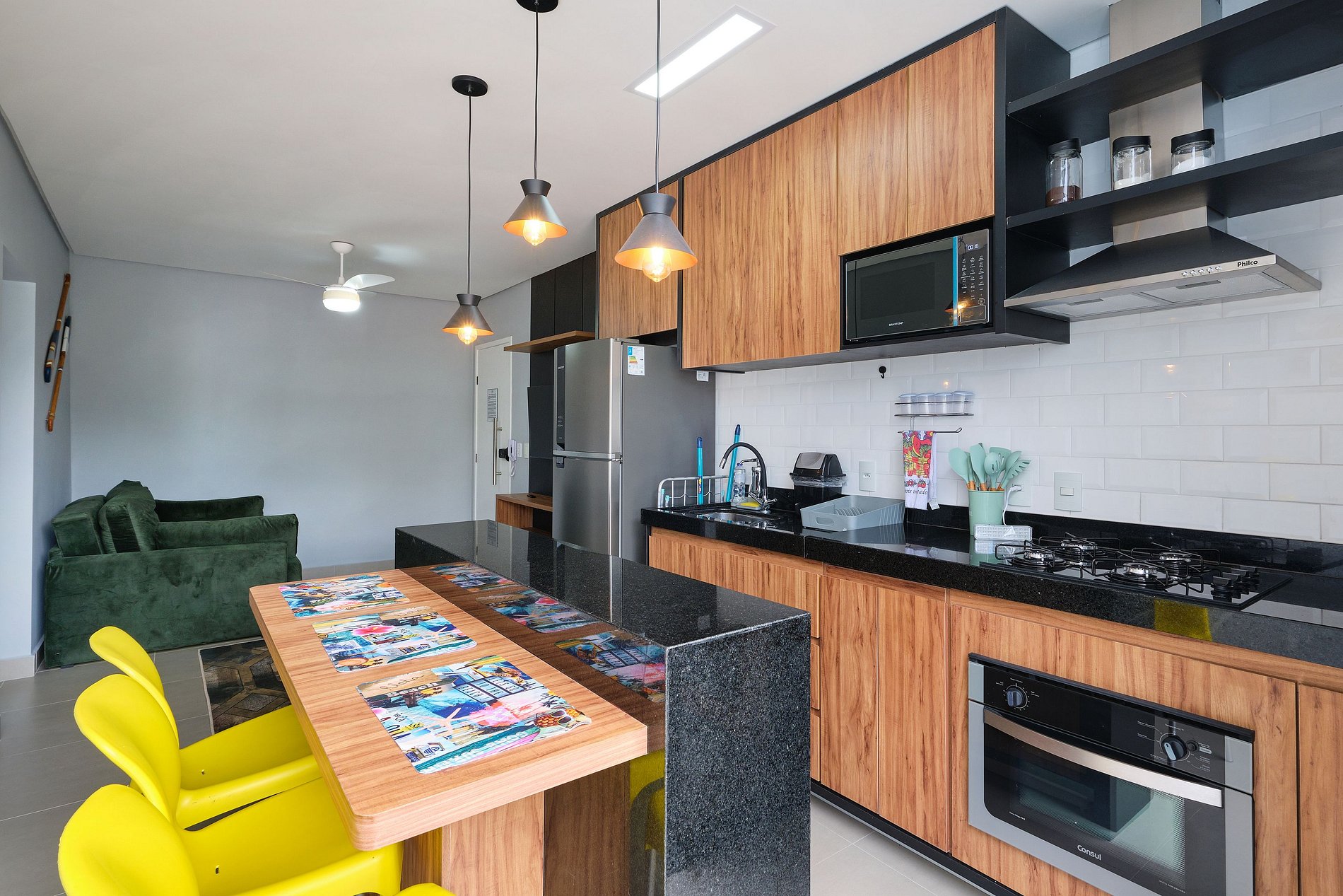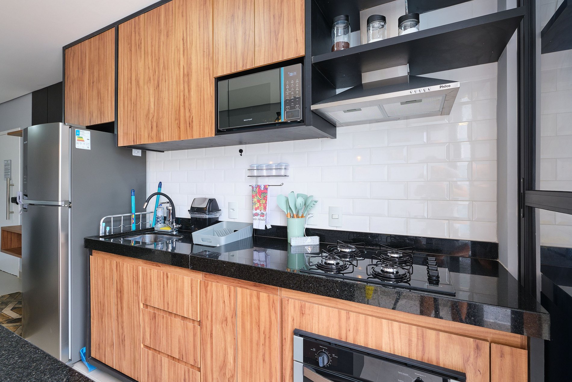 * Cozinha completa: fogão, geladeira, micro-ondas, forno elétrico, utensílios e talheres