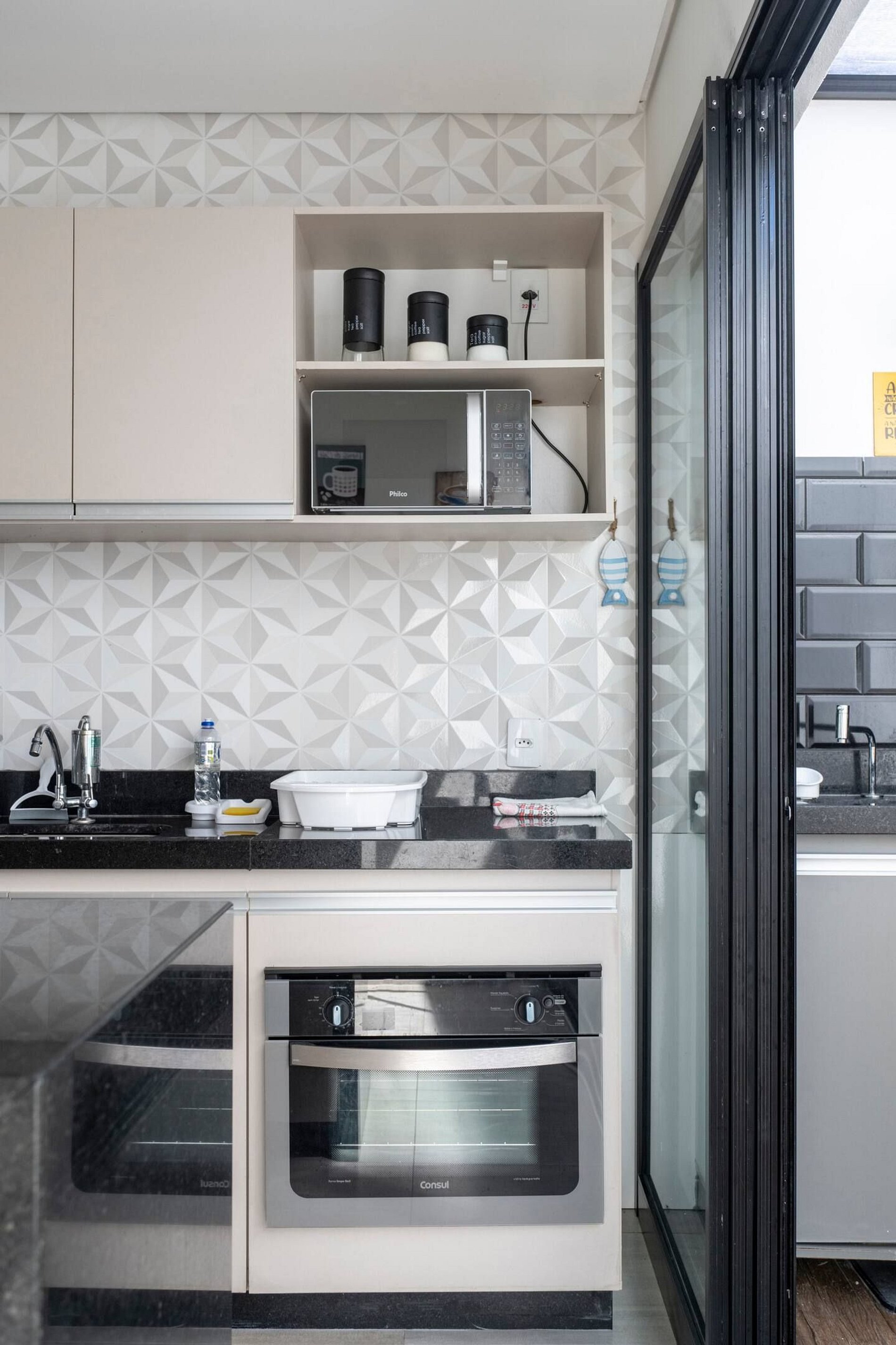 * Cozinha completa – fogão, geladeira, micro-ondas, forno elétrico, utensílios e talheres