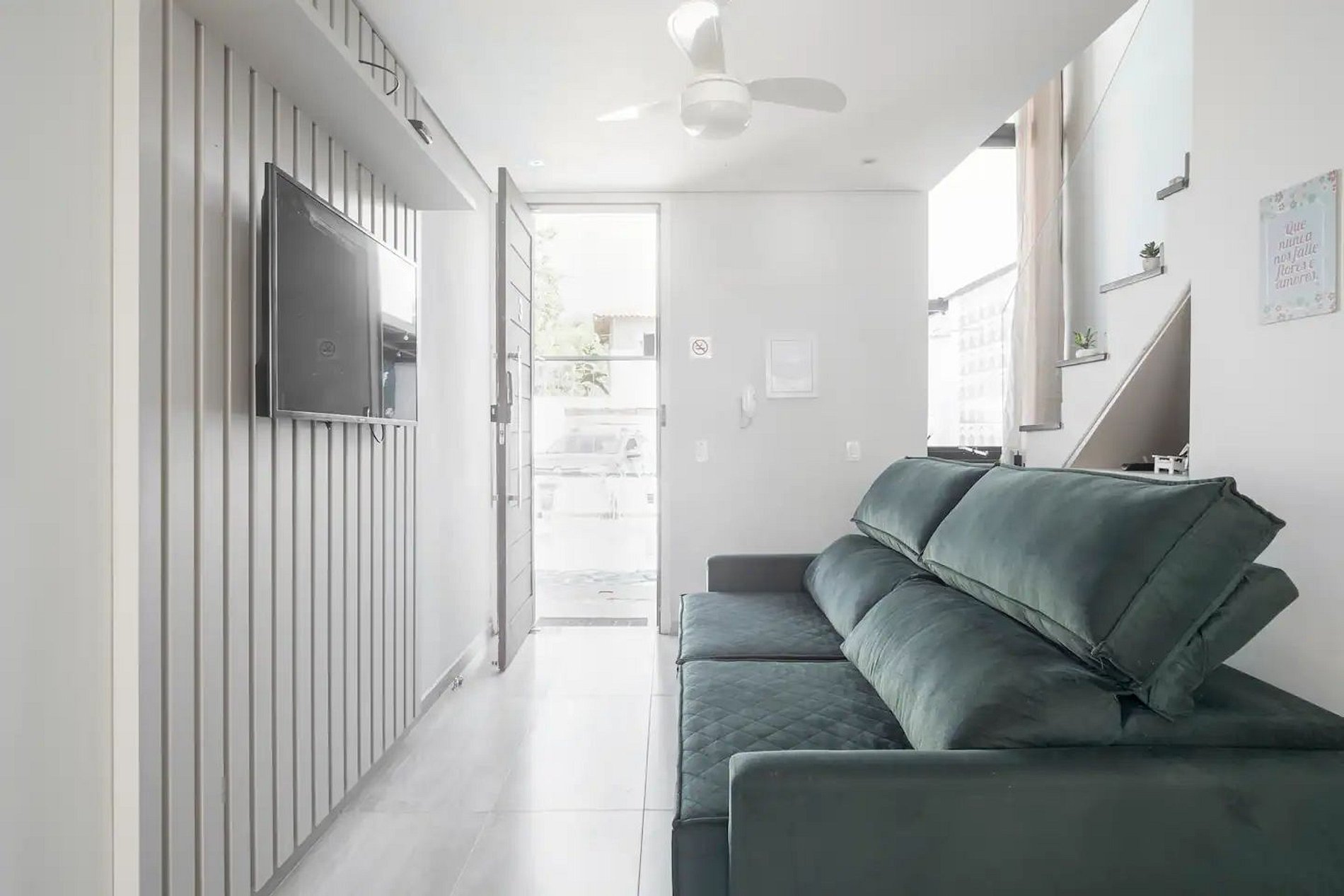 * Sala com ventilador de teto e sofá cama de casal