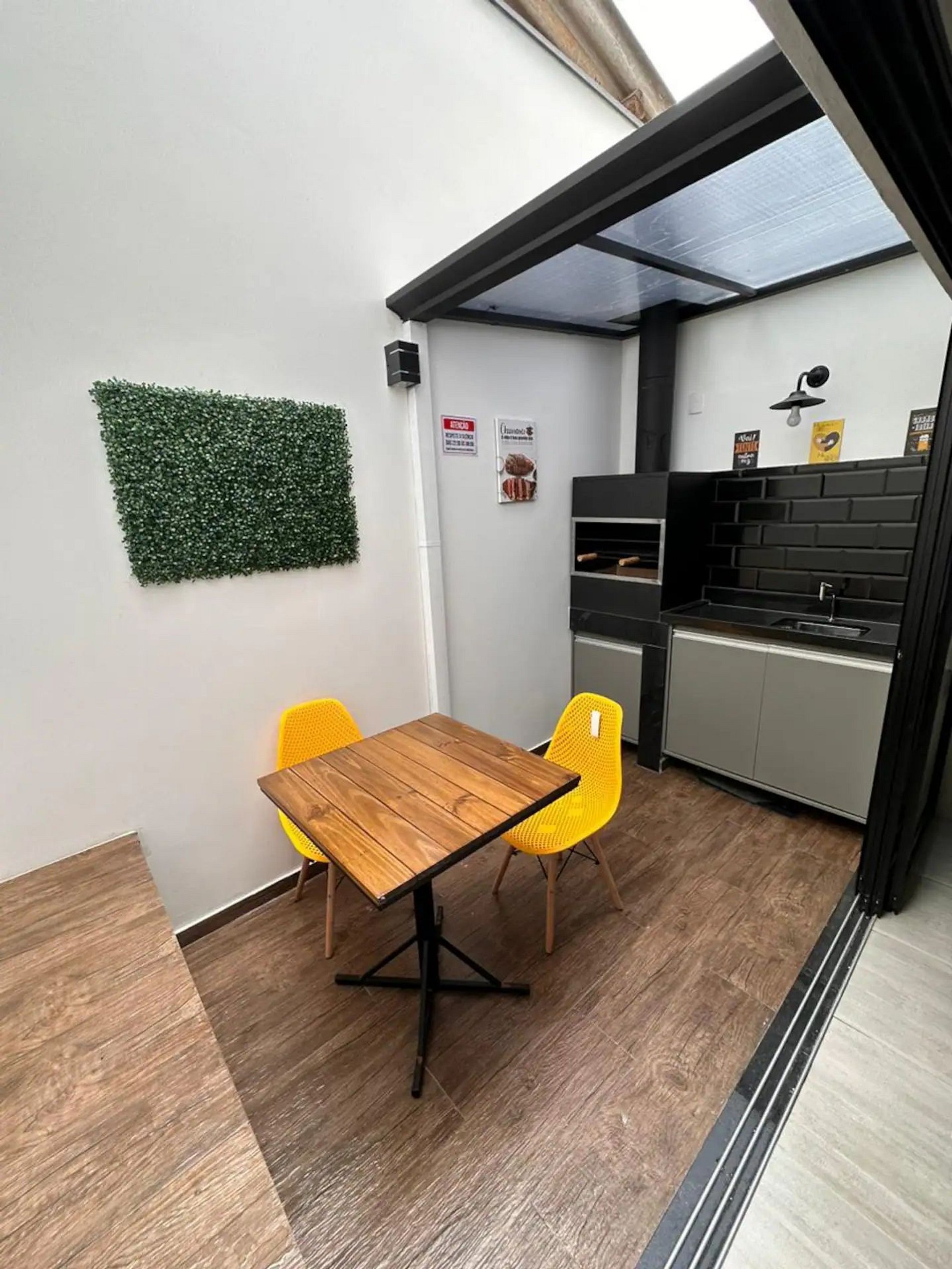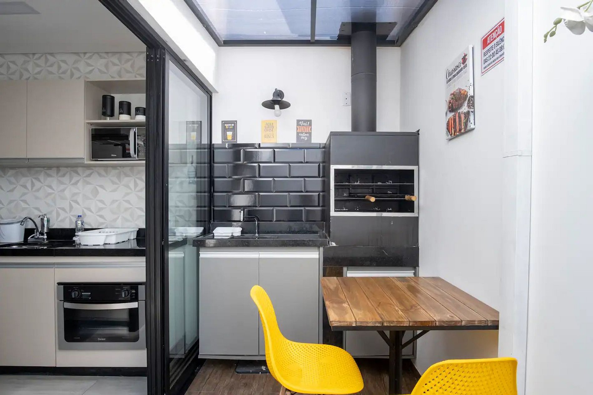 * Área interna com churrasqueira e mesa de refeições, ideal para reunir a família ou amigos